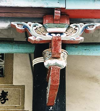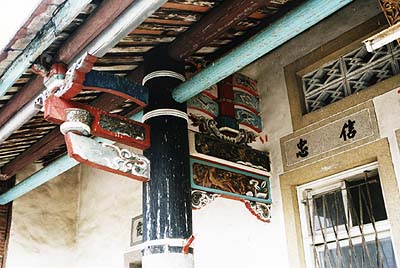 A tablet beside the porch relates that the family is directly descended from the Han emperor of some two thousand years ago and implies that the Hakka were political refugees in Taiwan, not economic refugees like the Hokkien. The characters (tai-i-chung-kuang) behind the entrance show the clan’s desire to recover China, a recurrent theme in Taiwan’s history. The swallowtail roof over the porch and central shrine reflect the Mandarin status of the family, which held extensive properties prior to the 1956 land reforms. |