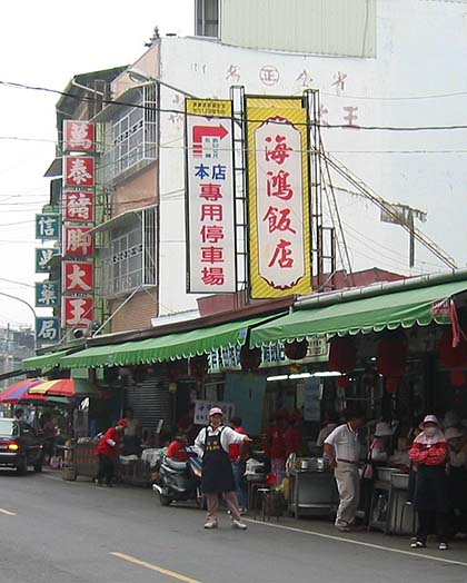 At the end of a journey one’s thoughts turn to food. Some excellent noodles can be found in front of the basilica gates at Wanchin, appropriately enough in Hakka style after all the enmity has become history. For a weightier repast, or especially to stock up for a picnic, an excellent choice is to head back to the district town of Wan-luan to sample its famous pork leg. Here it seems that every little restaurant or even hotel was once patronised by the late president Chiang Ching-kuo. People and the signs of the exasperated will soon direct the curious to the street near the main municipal market which specialises in this particular delicacy. The women here will be only too keen to sell you the braised legs and knuckles and to cut them up into convenient eatable chunks accompanied by bags of a special sauce. The nearby Wan-luan market teems with cheap fresh produce, including mountain delicacies. |