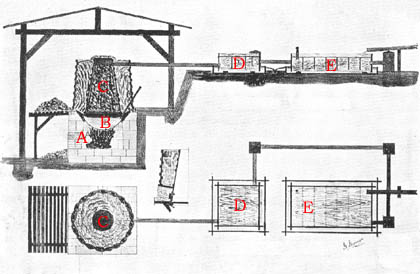 In the full-size picture, two men loading chips into the top of the retort (C) and the fire-boxes (A) are visible. The other man shown is removing the 'spent' chips from the retort through an opening (F) that is sealed during operation. |