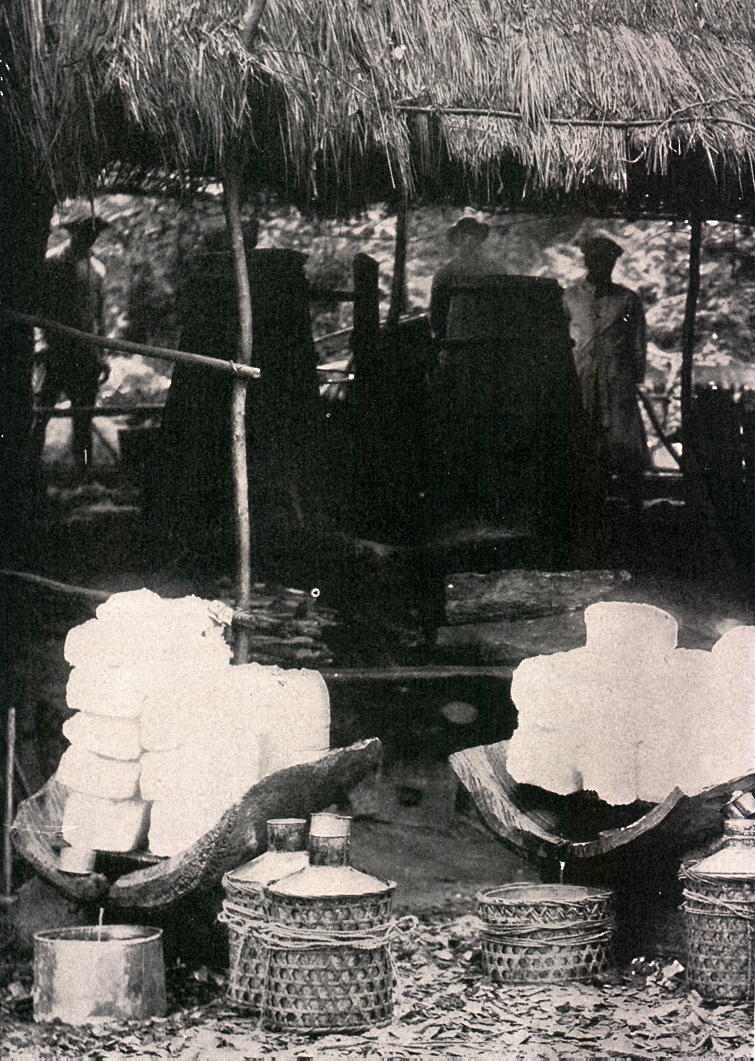 The boxes had typically six internal baffles to provide a greater surface for crystallization flowers. The camphor clinging to the boards is then scraped off and placed in tubs 'looking for all the world like so much snow'. |