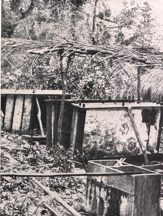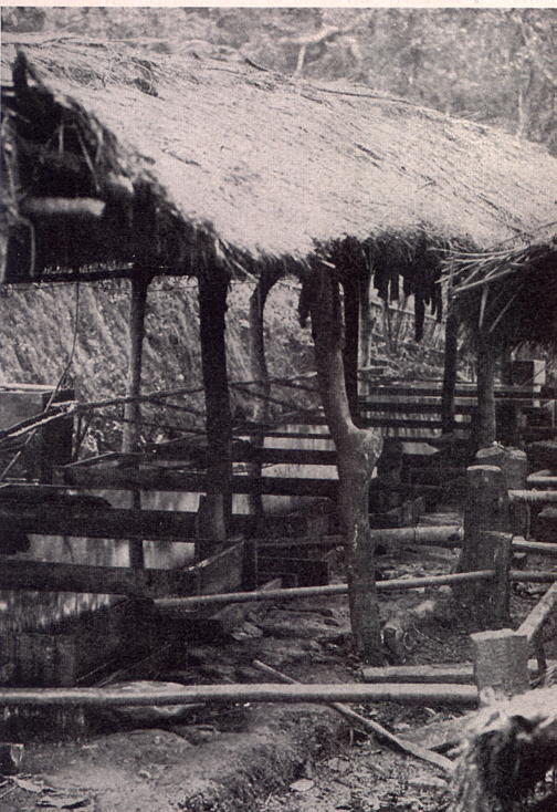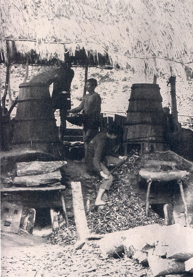 The suitable site for the still is on sloping ground near a water source. The elevated part of the site allows the crystallization boxes (E) to be at a distance from and well above the top of the chip retort (C). Water, preferably from a spring, can then be channeled down in bamboo guttering to flow over the boxes, to enhance cooling and thus condensation, and into a reservoir for use in the water-pan (B). The site needs first to be cleared and a solid base prepared for the 'stove' or still itself. Structures are then built over the locations for the stove and crystallization boxes before construction begins. The stove consists of the fire-box (A) which is controlled by adjustment of the single opening for fuel. Above the firebox is the water-pan (B) which was about the size of a large 'wok', this is kept filled with simmering water through a small pipe from the reservoir. The volume of steam produced from the water in the water-pan is critical to the process and must be skillfully controlled by the fire keeper. On top of the water-pan is placed a perforated board and on this the actual chip-retort (C), which is encased within a second tapering cylinder with the gap filled with mud to seal and to insulate the still itself. The chip-retort typically narrows from two and a half feet at the base to less than a foot at the top, and stands about four feet tall. The steam from the water-pan is thus forced through the chips in the retort and out through a bamboo pipe sealed into the top of the retort. The average stove holds about 400 lbs (180 kg) of camphor wood chips and needs to be emptied and replenished each day. The bamboo pipe leads away from the top of the retort to the cooling (D) and crystallization chambers (E). The vapour from the stove is cooled both by the distance and by the water that flows over the tops of the chambers. A series of baffles within the crystallization boxes ensure that the optimal surface area is presented for the cooling vapour to form crystal flowers. The process is usually continued for a week to ten days after which the furnace is cooled and the camphor extracted from the crystallization boxes. The raw Camphor is allowed to stand and the yellowish Camphor oil to exude from the snow-like residue. The resultant Camphor and Camphor oil are then carried to market. |