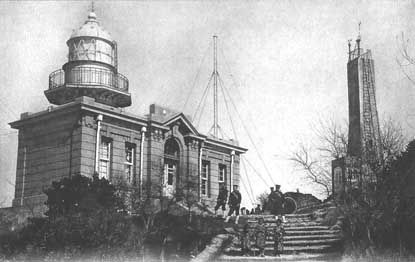 Early in 1882 Stent was appointed to Takow, and in May 1883 he became Assistant-in-Charge. In this capacity Stent was responsible for the erection of the first lighthouse built on Saracen's Head (at Chihou, 旗津). The lighthouse was designed by the Welsh CMC Engineer-in-Chief, John Reginald Harding. The red-brick structure carried a No 6 single-wick light with a range of about 10 nautical miles. The present structure, built by the Japanese in 1918, is shown in the adjacent photograph with the Stent structure to its right. |