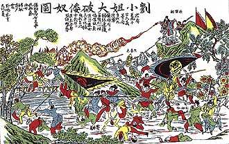 Chinese Poster depicting 'The Great Defeat of the Japanese (Dwarf Slaves) by Liu's Daughters' (click to enlarge) |
