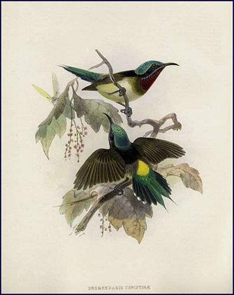 Engraving of Mrs Swinhoe's Sunbird (Aethopyga christinae) by J. G. Keulemans from G. E. Shelley; A Monograph Of The Nectarindae, or family of Sunbirds. |