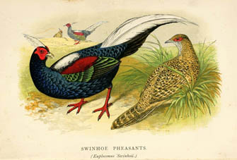 | Perhaps the most famous of Swinhoe's discoveries was the Swinhoe Pheasant (Euplocamus swinhoii) which is an endemic species found (at that time) throughout the island from north to south but particularly prevalent in the middle part of the central mountain range. This bird was given the binomen Euplocamus swinhoii by Gould in 1862, with the specific name honouring its discoverer Swinhoe, adding "This exceedingly beautiful species is one of the most remarkable novelties I have had the good fortune to describe...In dedicating this fine bird to Mr. Swinhoe, I feel that I am only paying a just compliment to a gentleman who must ever rank among the foremost of those travellers who have enriched ornithology by their numerous eastern discoveries" | |||||