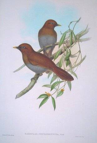 Garrulax poecilorhynus or Grey-sided Laughing Thrush from J Gould's 'Birds of Asia' 1864 |