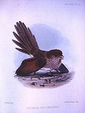 Illustration of Formosan Netgamble (Suthora bulomachus) by Joseph Wolf from The Ibis 1866 |