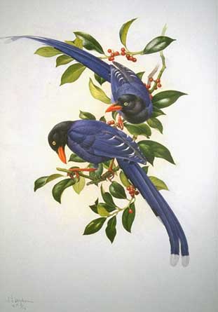 The stunningly beautiful illustration on the left shows the Formosan, or Taiwan Blue Magpie (Urocissa caerulea) as depicted by the Hong Kong born artist J Fenwick Lansdowne in the contemporary 'Rare Birds of China' series. The Taiwan Magpie was originally recorded by Swinhoe in 'The Ibis' in 1863 as the Long-tailed Mountain Nymph. This name is clearly derived from the local Taiwanese name meaning 'long-tailed mountain girl', which poetically describes the sight of this bird in flight as its tail feathers, tipped in white and making up half its length, flow behind it. This Blue Magpie is endemic to Taiwan and can be seen particularly in the hilly regions of the north of the island. However this brilliantly coloured bird, with sapphire blue plumage can be found at middle to low elevation throughout the island. A group of Formosan Blue Magpies in flight, which may be as large as 20 birds, is an unforgettable sight. |